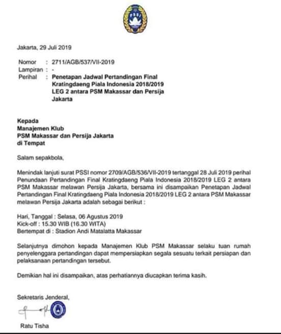 Makassar Sulsel, Porosnusantara.co.id – Jadwal ulang laga tunda final Piala Indonesia leg 2 antara PSM Makassar vs Persija Jakarta rencana akan digelar Selasa, 6 Agustus 2019.