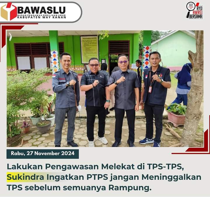 Way Kanan, porosnusantara.co.id – Ketua dan Anggota Bawaslu Way Kanan Sukindra Rahayu, Lekat Rizwan,Lukman Latip dan Sigit Dwi Suwardi memilih di TPS yang sesuai C-Pemberitahuan yang mereka terima dari KPPS setempat, Rabu 27/11/2024.