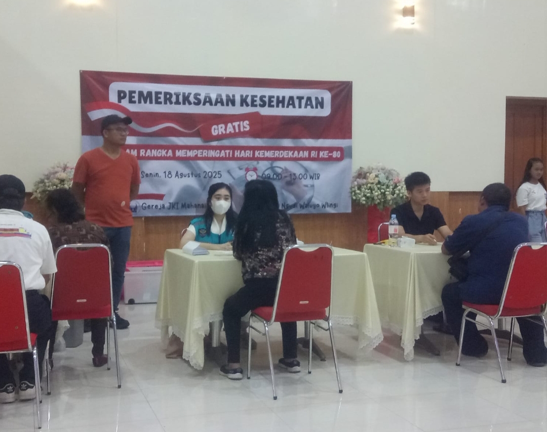 PorosNusantara.co.id – Blitar || Dalam rangka memperingati Hari Kemerdekaan RI ke – 80 Gereja JKI Mahanaim bekerjasama dengan RSUD Ngudi Waluyo Wlingi bersama jemaat dan panitia pelaksana mengadakan Bakti Sosial Pemeriksaan Kesehatan Gratis bagi masyarakat umum pada Senin (18/8/25).