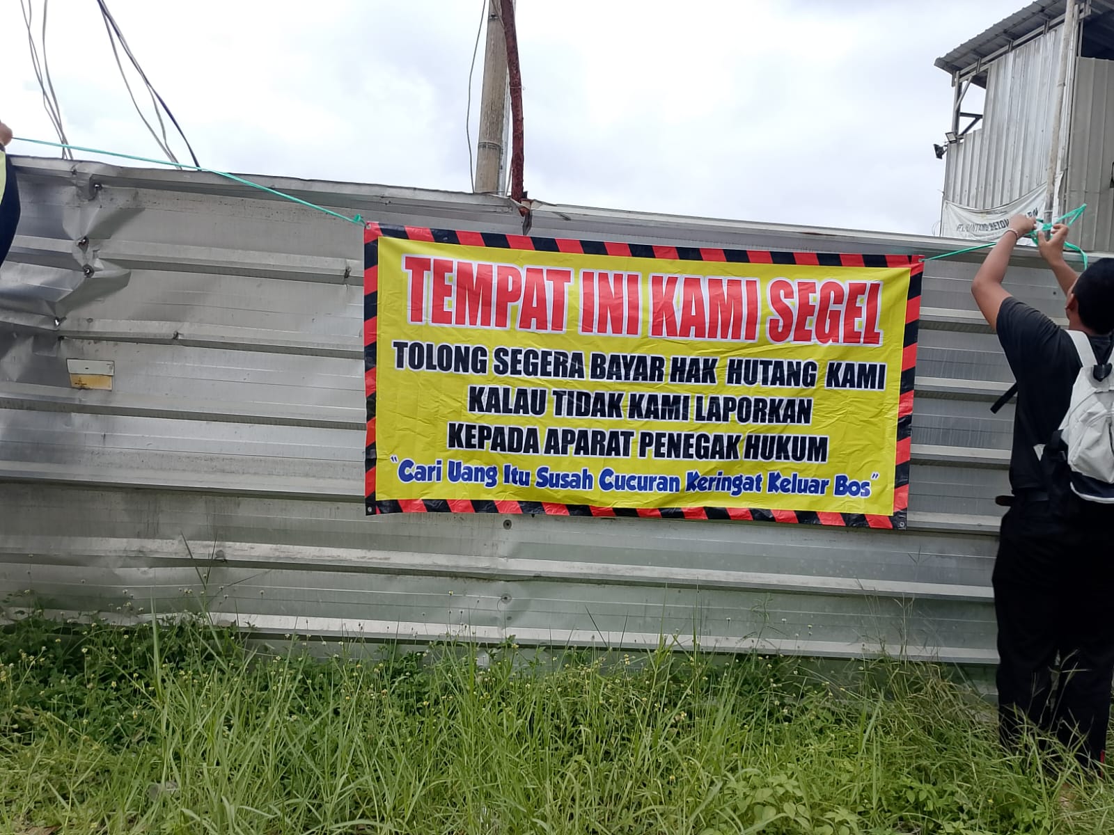 “TEMPAT INI KAMI SEGEL. Tolong segera bayar hak hutang kami. Kalau tidak, kami laporkan kepada aparat penegak hukum. Cari uang itu susah, cucuran keringat keluar bos!”