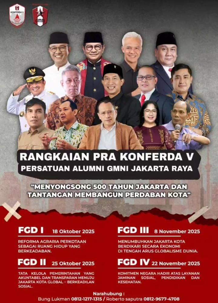 Porosnusantara.co.id|Jakarta – Di tengah derasnya arus liberalisasi tata kota dan komersialisasi ruang hidup warga, Persatuan Alumni GMNI Jakarta Raya menggelar rangkaian Pra Konferda V sebagai momentum merebut arah pembangunan Jakarta agar kembali berpihak kepada rakyat pekerja, bukan kepada kepentingan modal.
