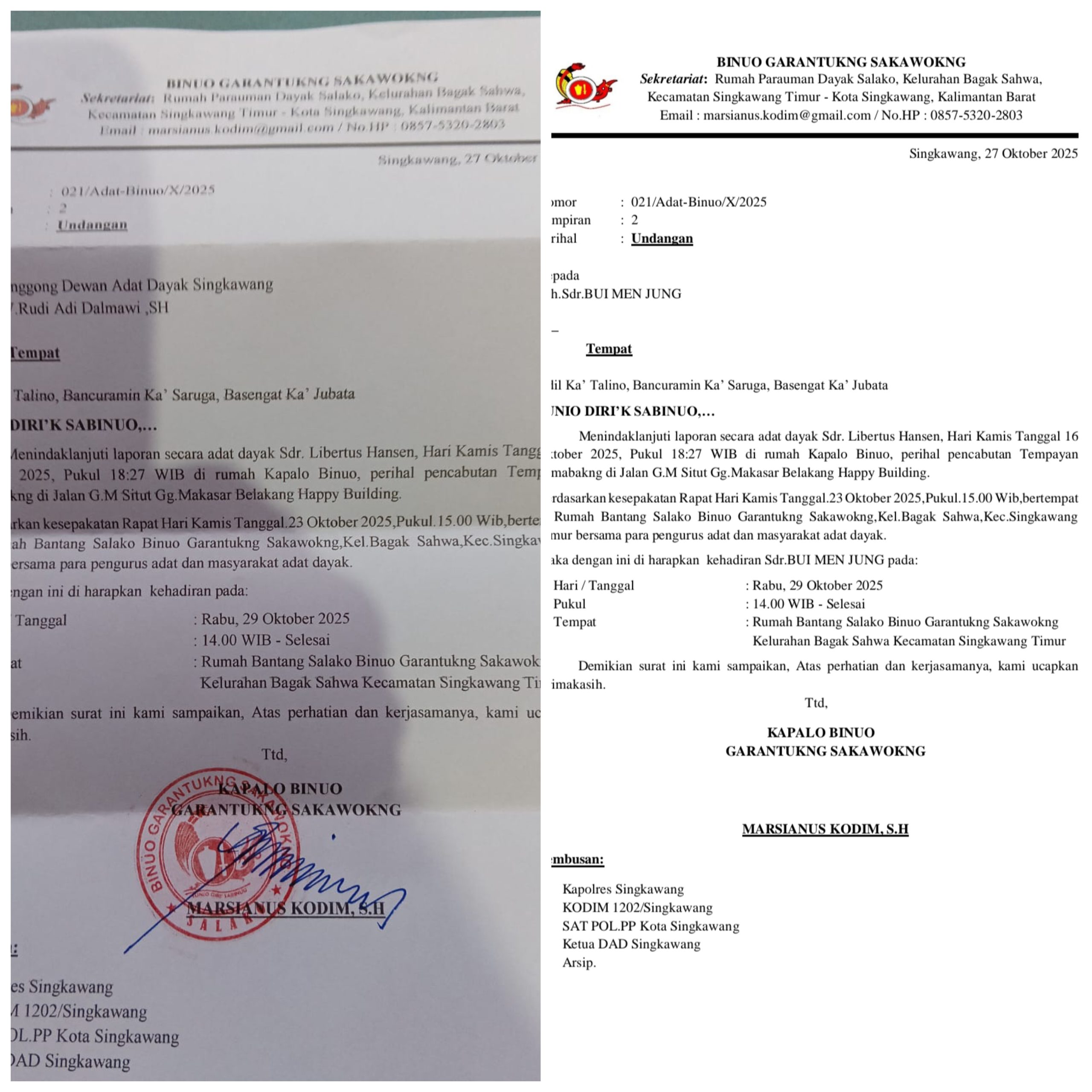Singkawang – Kalimantan Barat (Minggu 26/10/2025). Kapalo Binua Garantukng Sakawokng Marsianus Kodim SH kembali memanggil untuk kedua kalinyaTimanggong Rudi Adi Dalmawi SH untuk hadir di rumah Bantang Salako Binua Gerantukng Sakawokng Bagak Sahwa untuk didengar klarifikasi terkait pencabutan atribut adat berupa tempayan adat di jalan GM Situt Gang Makasar bersama anggota TBBR Anjungan. Pemanggilan ini berdasarkan hasil keputusan para pengurus adat dan masyarakat adat Dayak pada hari kamis tanggal 23 Oktober 2025 dimana yang bersangkutan tidak hadir.
